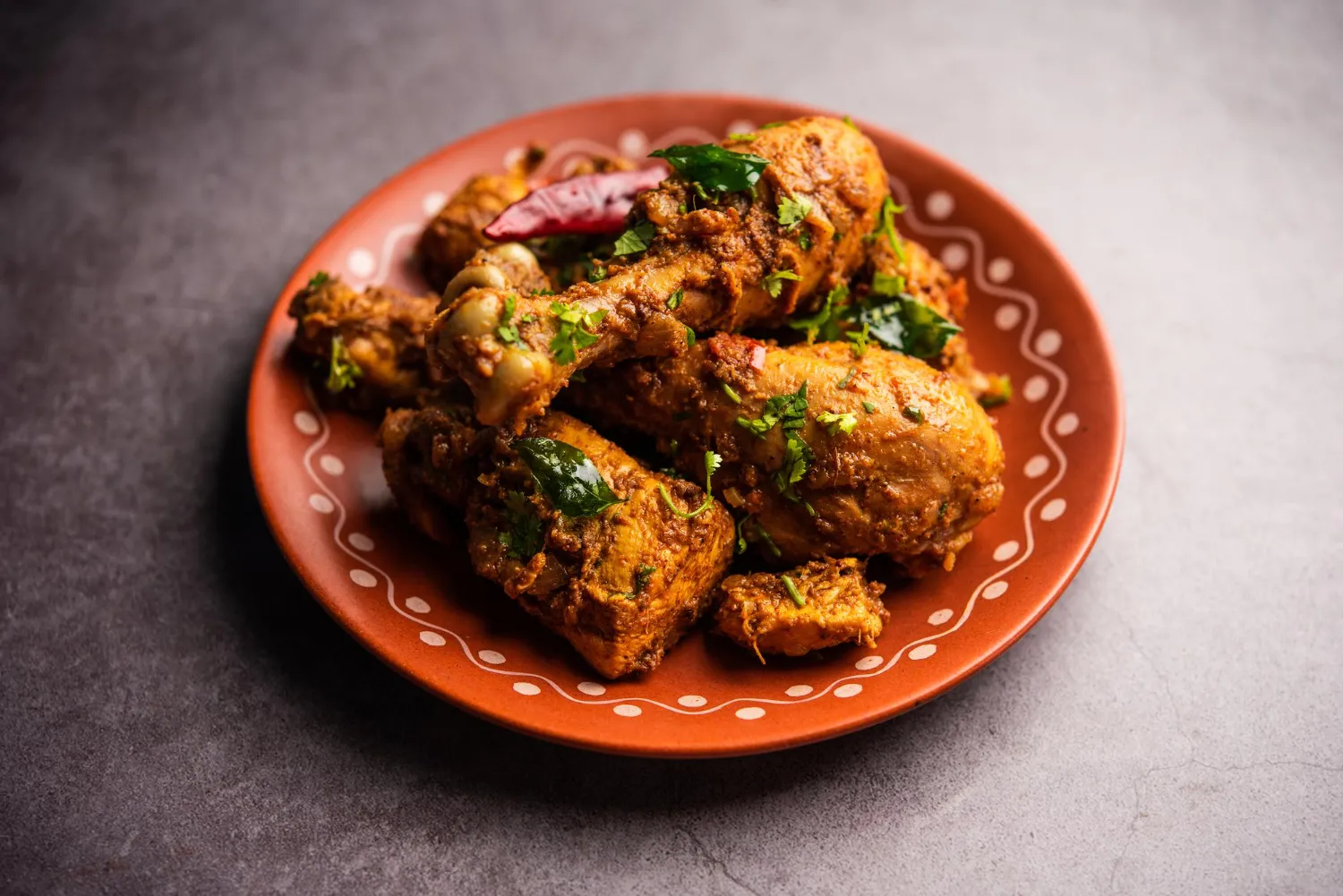 Chicken cooked with flavourful spices, curry leaves, and chili's in yougurt based sauce.