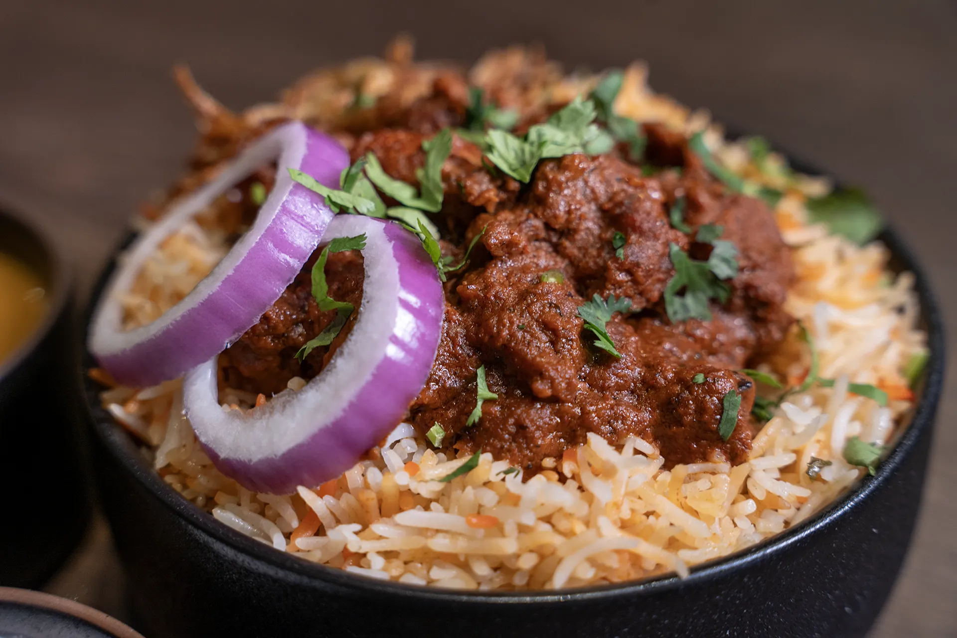 Bone-in goat marinated with spices and herbs layered with aromatic basmati rice and slowly cooked to perfection